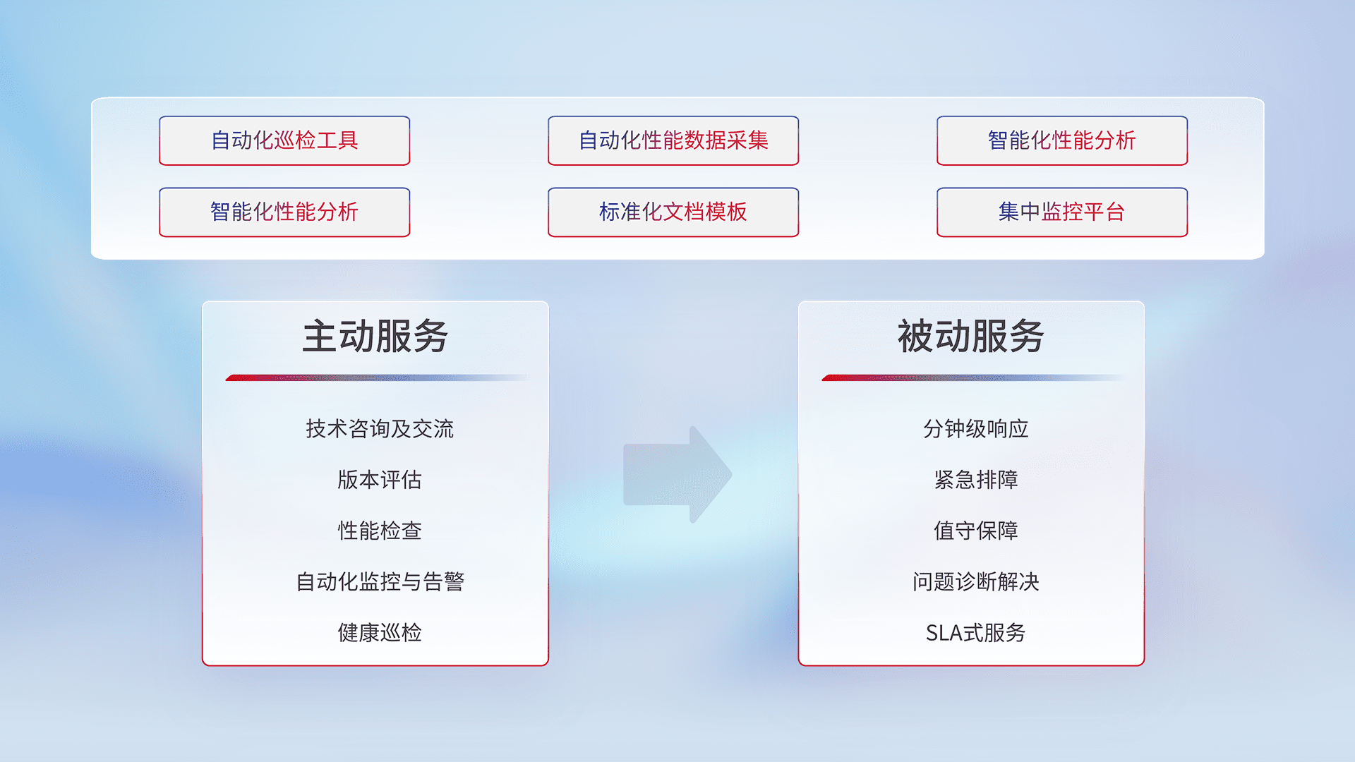 智能化工具和标准化文档,,,,保障服务质量,,提供主动服务(包含技术咨询、、、、版本评估、、性能检查、、、自动化监控与告警、、、、健康巡检)和被动服务包含(分钟级响应、、紧急排障、、、、值守保障、、、问题诊断解决、、、SLA服务)。。
